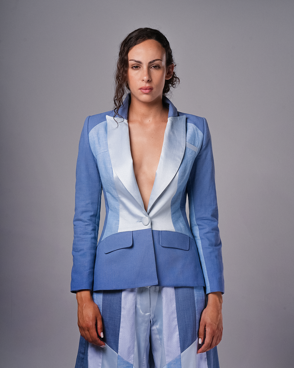 A statement in craftsmanship, this tailored patchwork jacket is crafted from a mix of linen and satin in varying blue tones. Designed with a flattering hourglass silhouette, it features structured tailoring, front pockets, and a sharp, polished finish. Fully lined in silk for luxurious comfort.