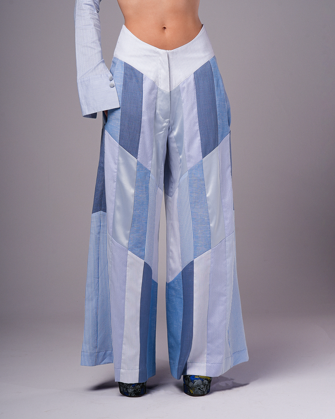 Crafted from a mix of striped and checkered poplin with linen, these tailored patchwork pants offer a unique blend of texture and pattern. The flattering V-shaped waistline adds a modern edge, while four functional pockets bring practicality to the bold design.