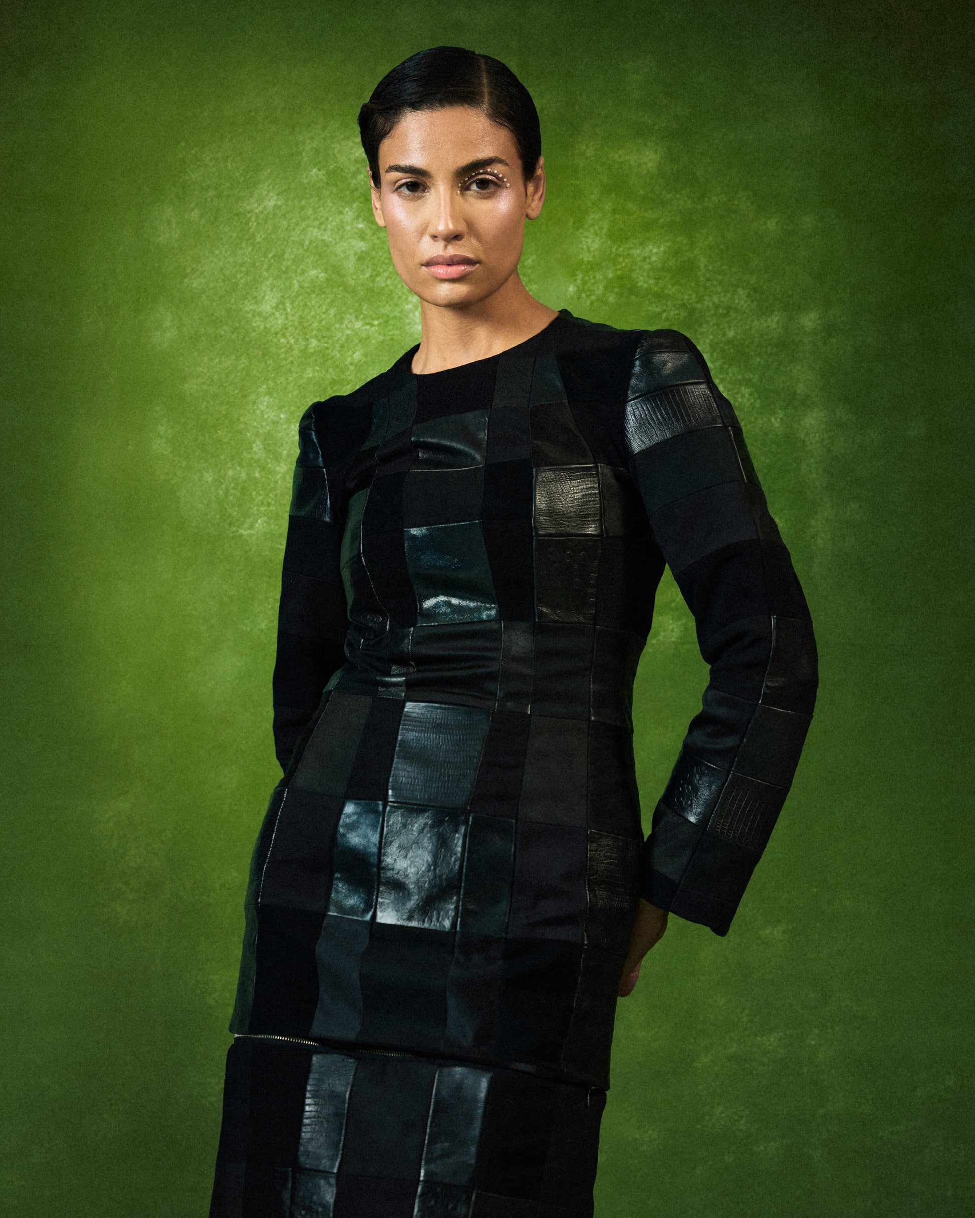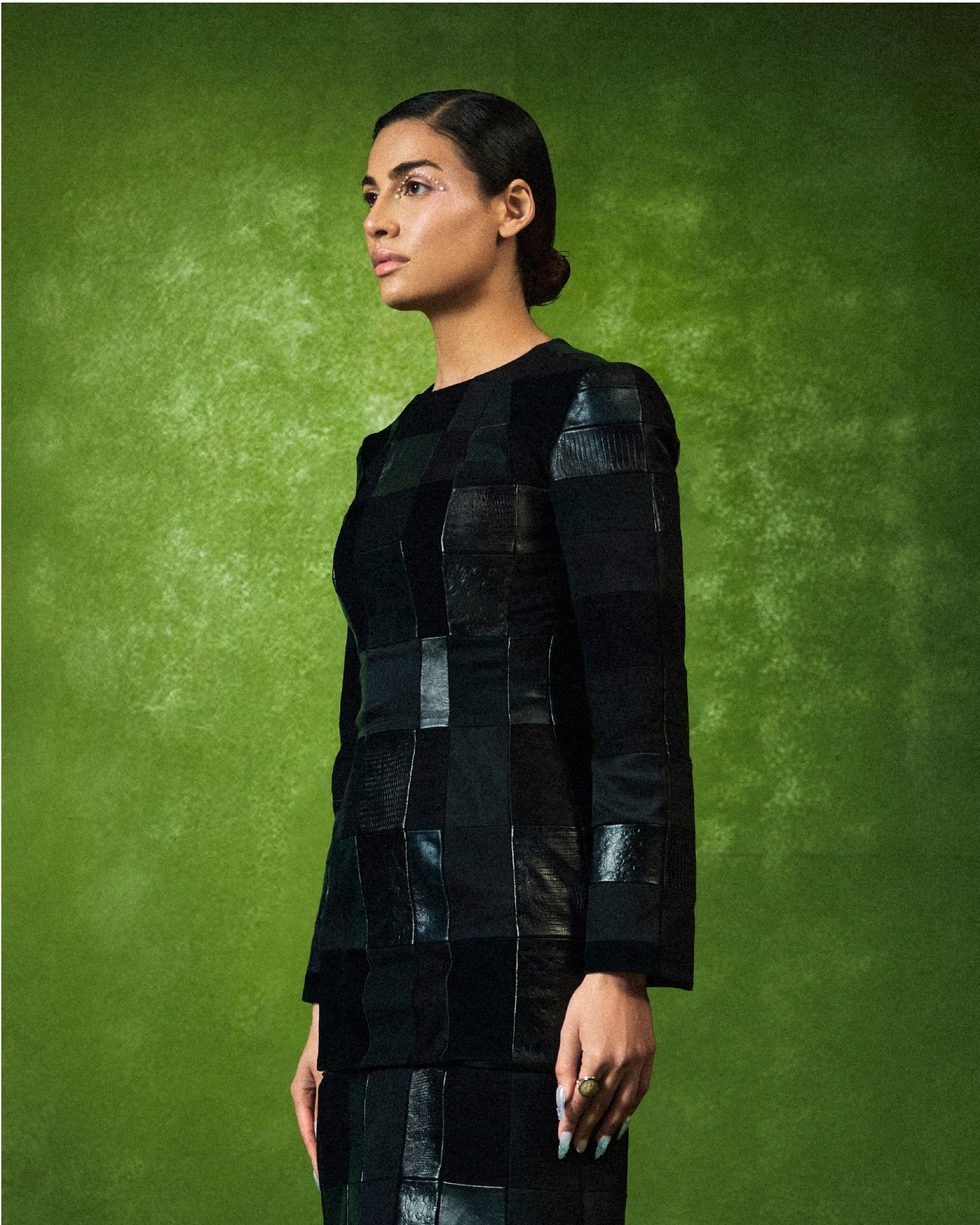 Crafted from alternating panels of supple leather and structured fabric, the silhouette is designed to sculpt the body with quiet authority. A detachable dress that can be 3 different lengths, it's construction allows the piece to transform, offering versatility without compromising its refined, architectural presence