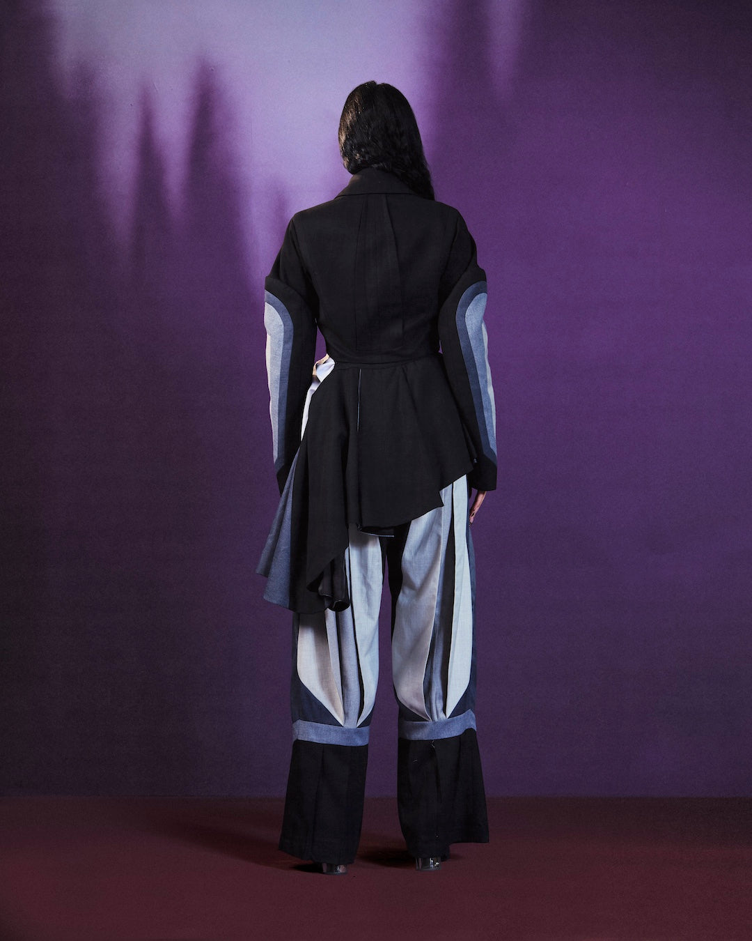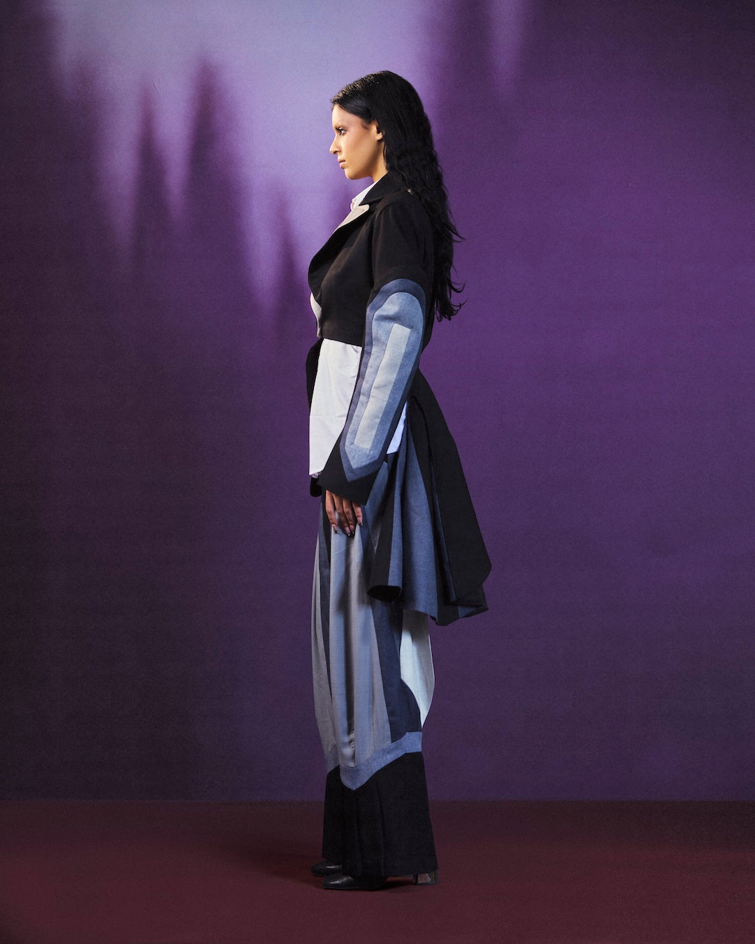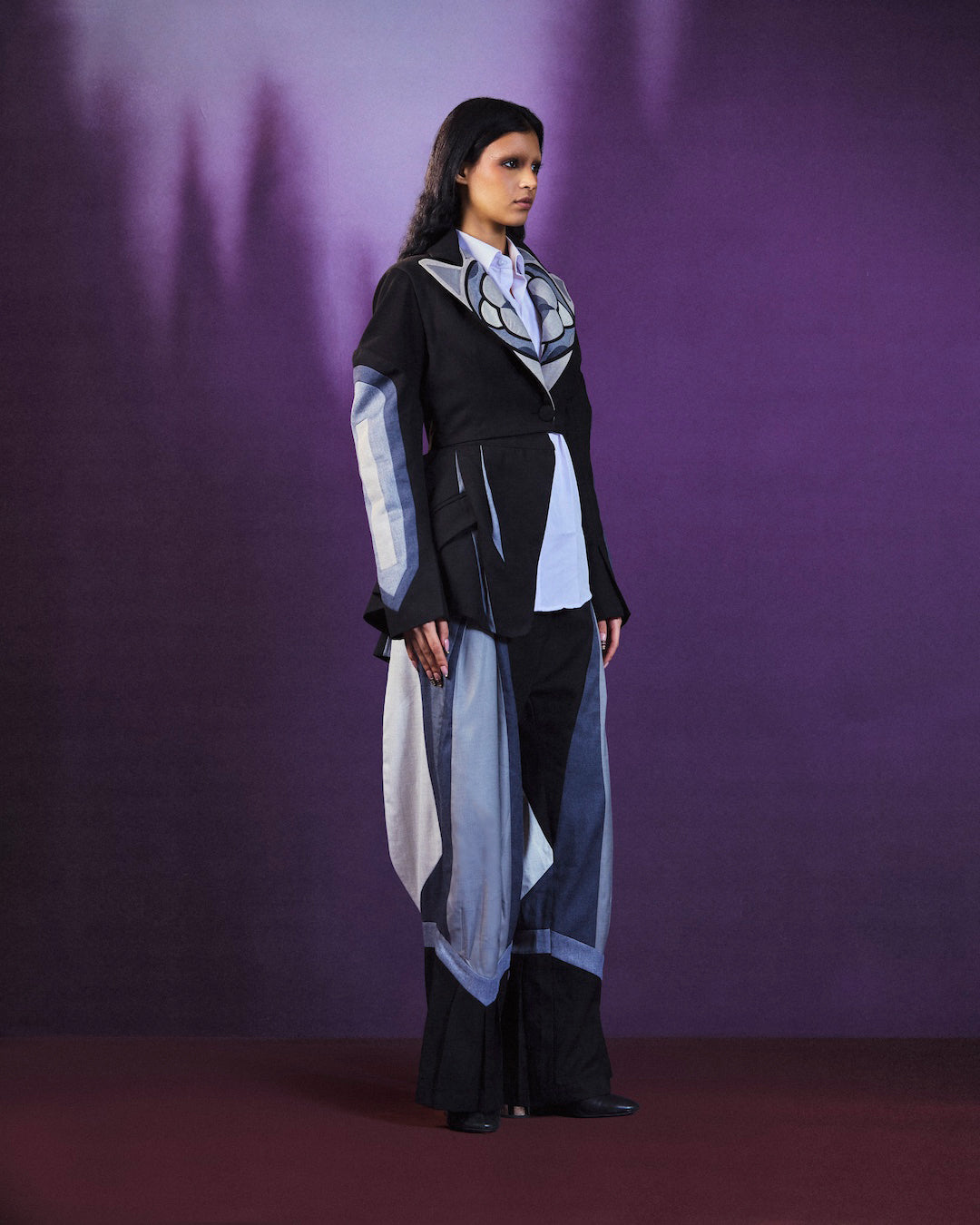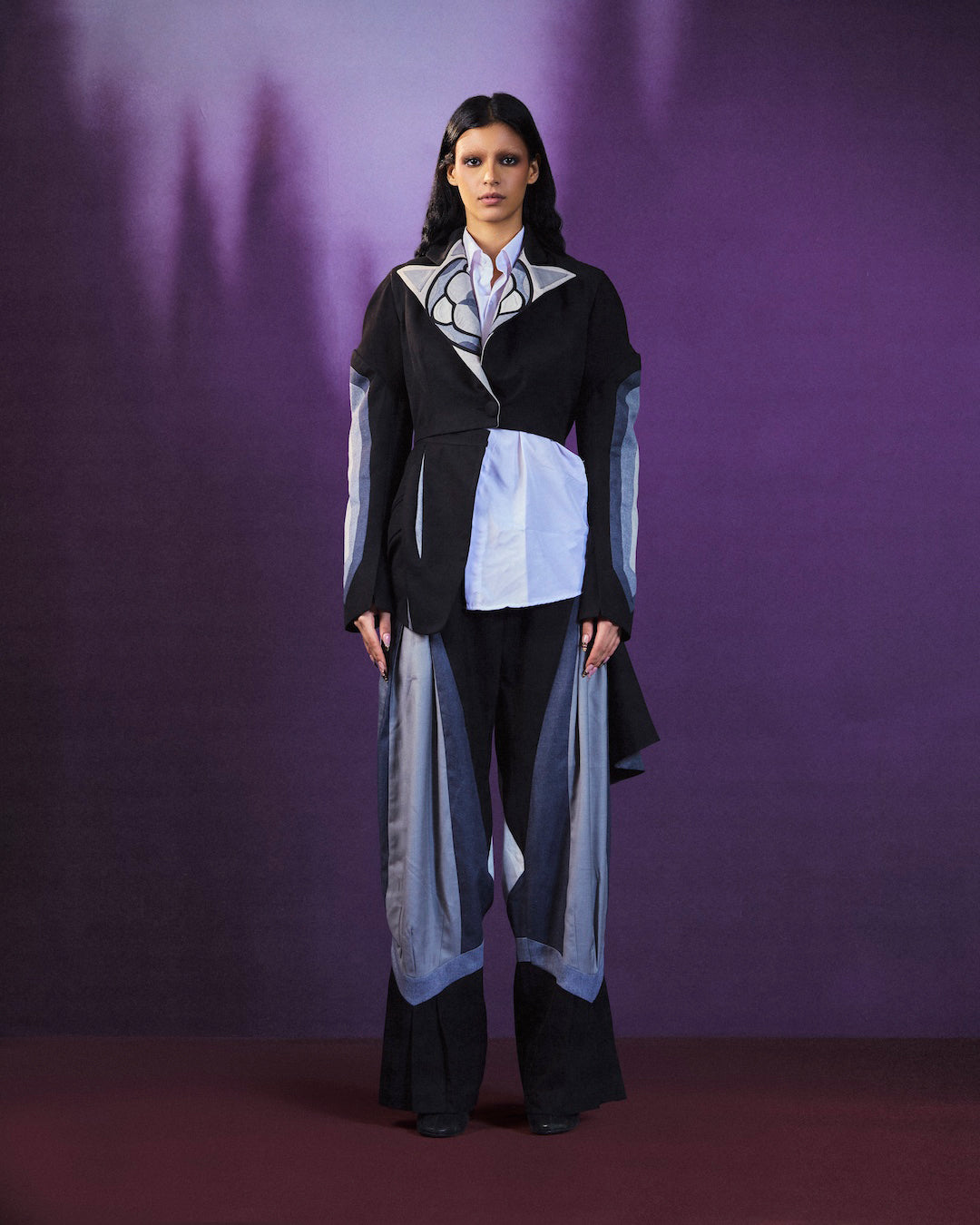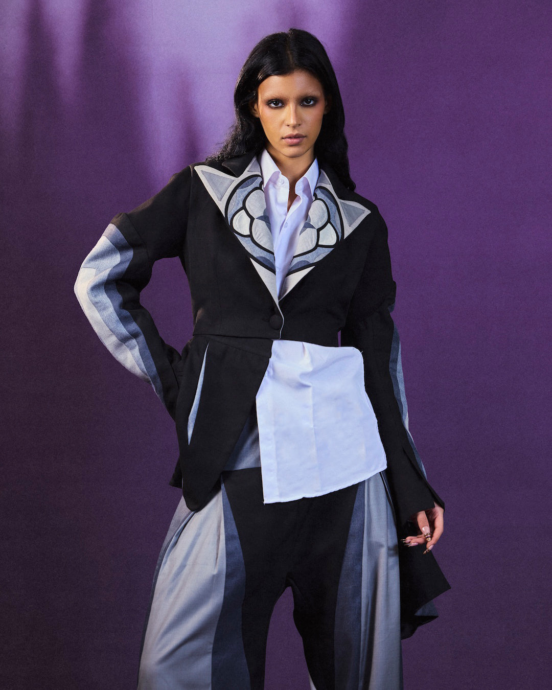 The look features a tailored base with a detachable bomber jacket, allowing for multiple styling options. Crafted with contrasting panels and clean lines, the set offers comfort, structure, and flexibility, making it suitable for both day and evening wear.