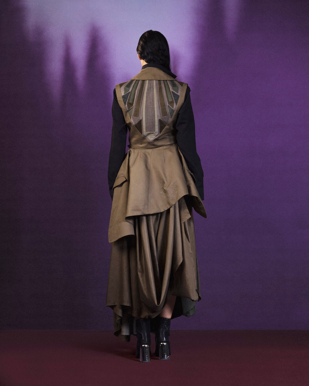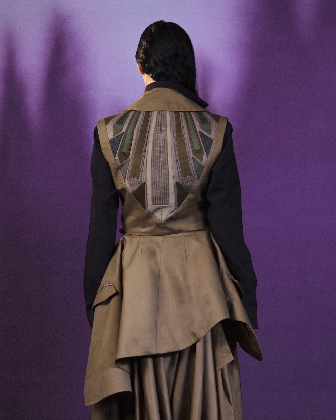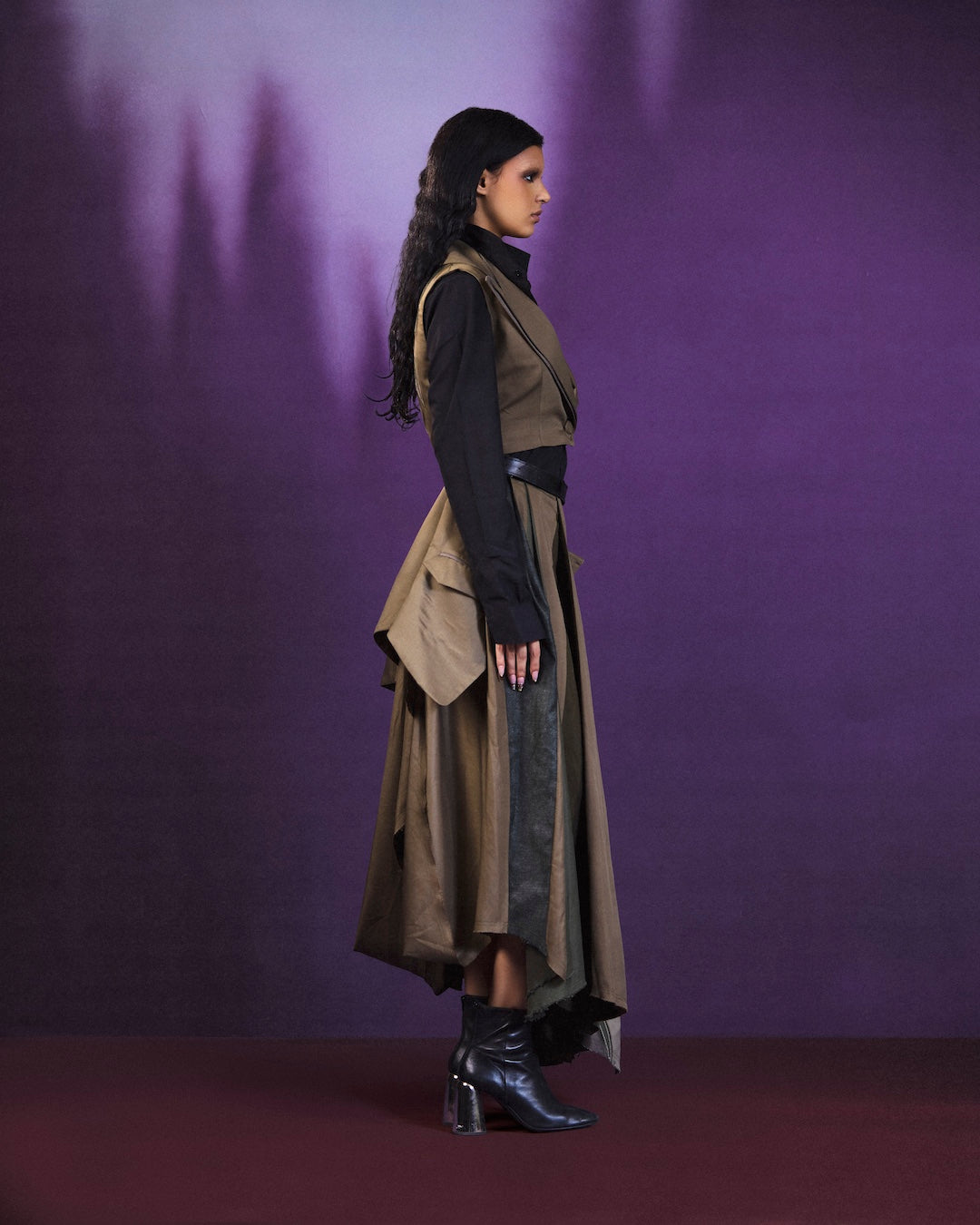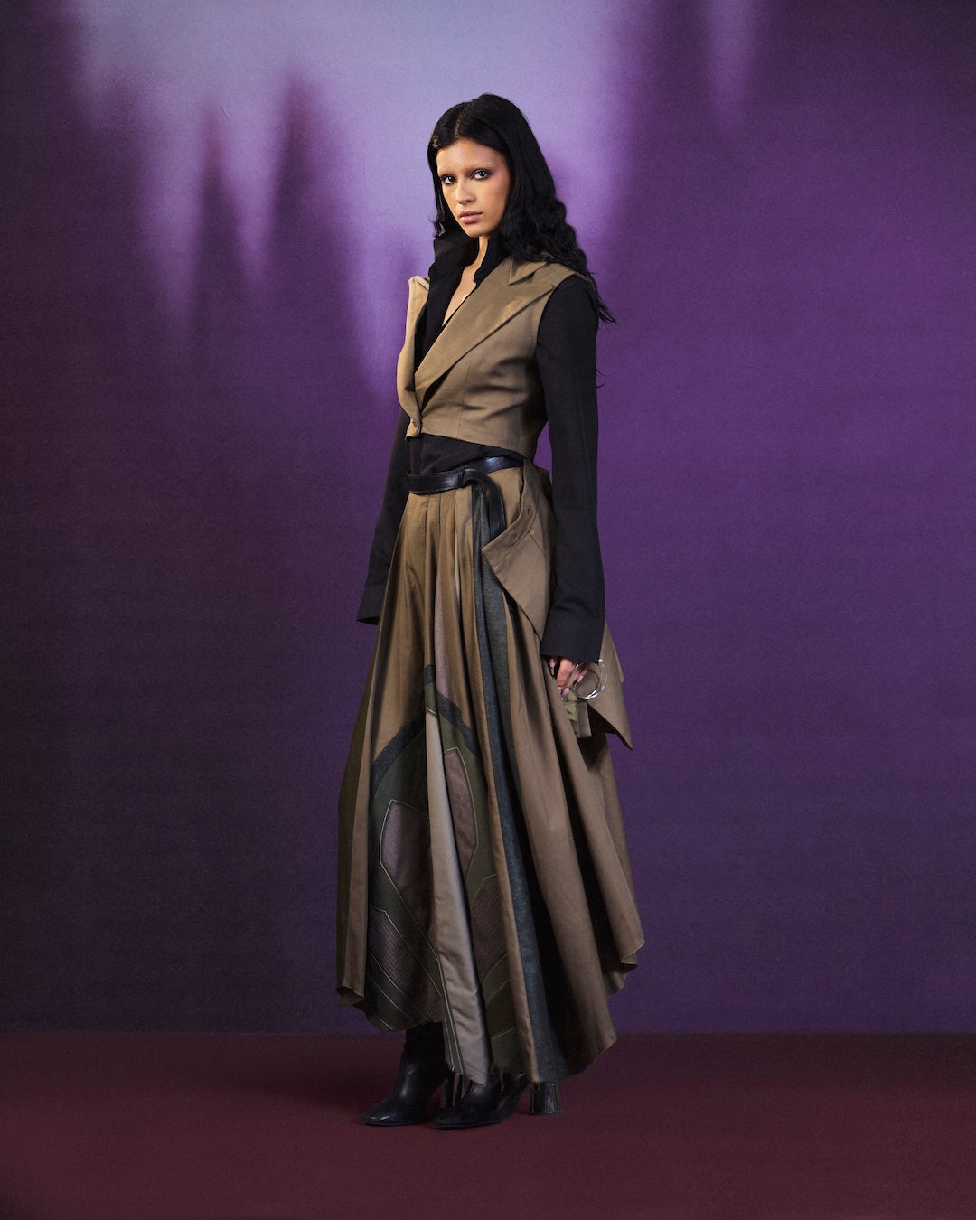 Rendered in deep olive tones, the tailored vest is paired with a flowing, layered skirt that moves with quiet confidence. Contrasting textures and precise paneling create depth and balance, offering an elevated silhouette designed for composed, effortless presence.