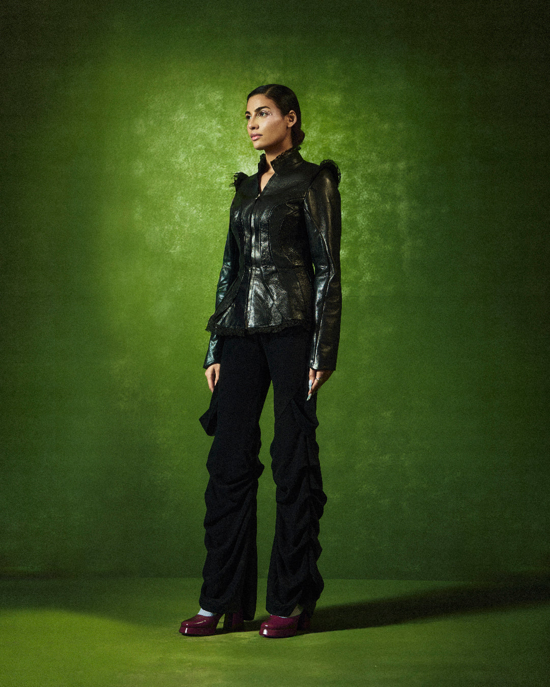 Sculpted leather jacket crafted for a commanding silhouette.
